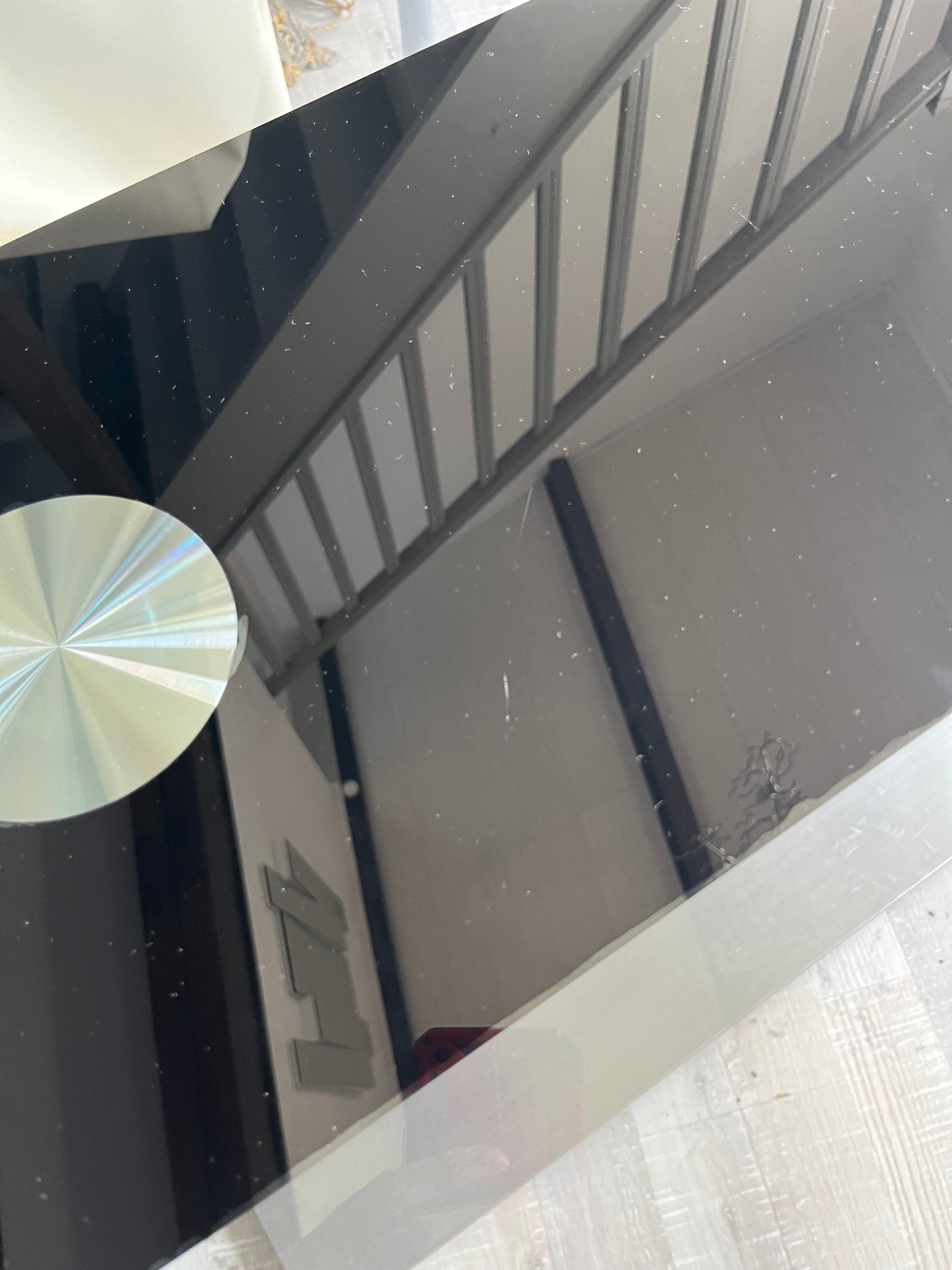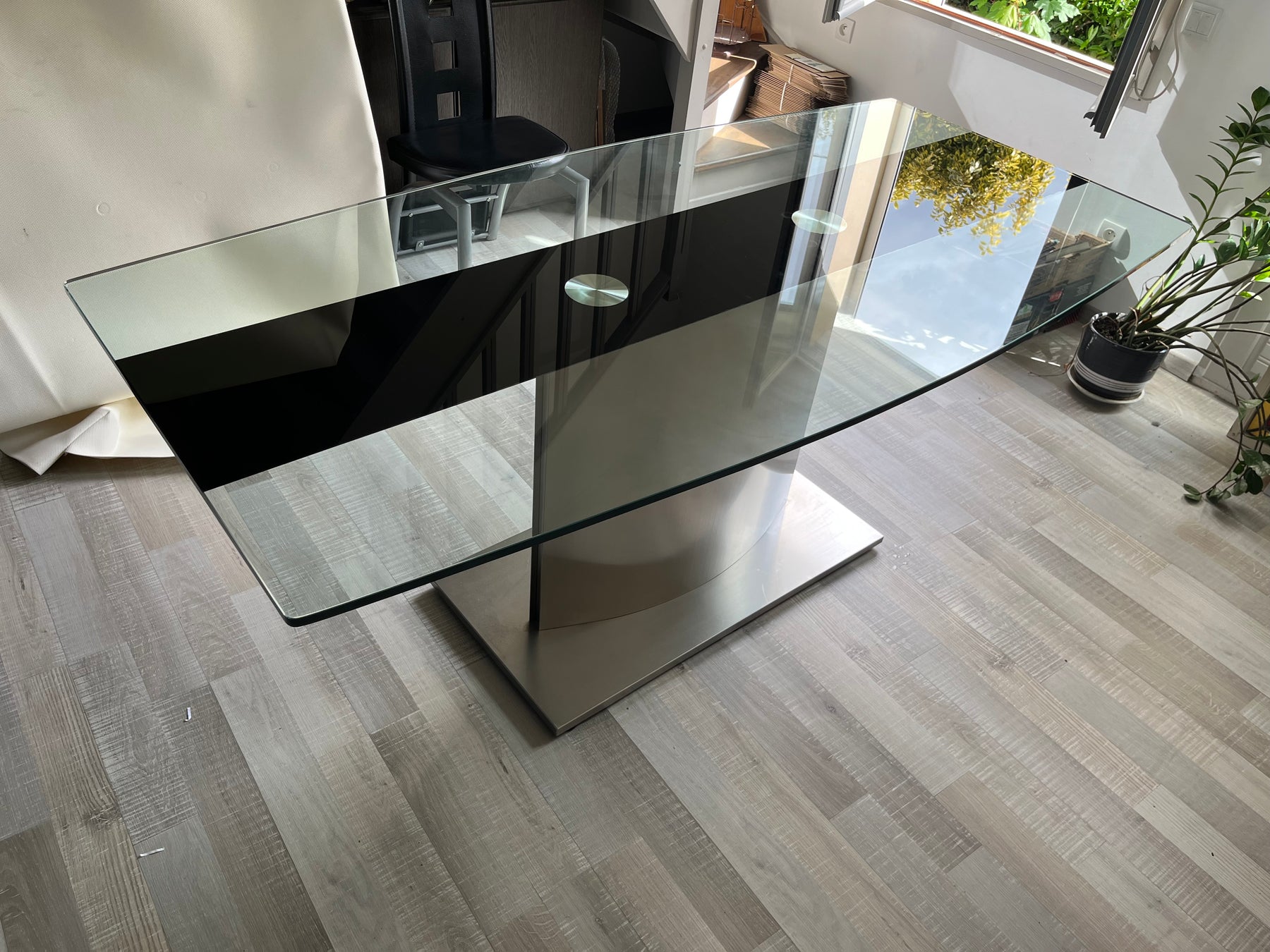 table design pour 6 à 8 personnes avec un piètement inox et un verre trempé en bon état avec 2 rayures d'usage