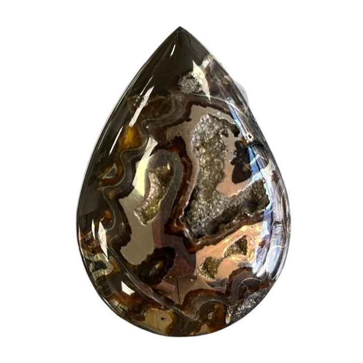 Cabochon en ammonite pyritisée, géode, pseudomorphe, fossile.