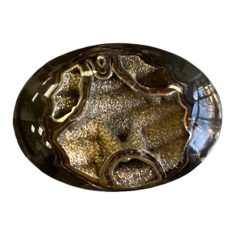 Cabochon en ammonite pyritisée, géode, pseudomorphe, fossile.