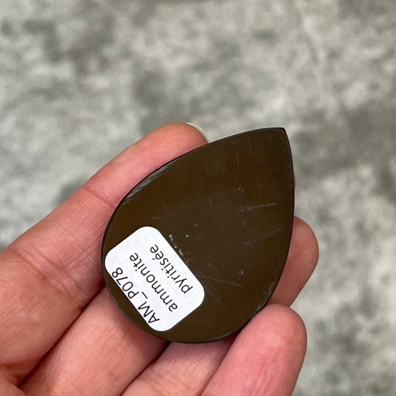 Cabochon en ammonite pyritisée, géode, pseudomorphe, fossile.