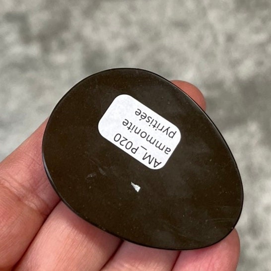 Cabochon en ammonite pyritisée, géode, pseudomorphe, fossile.