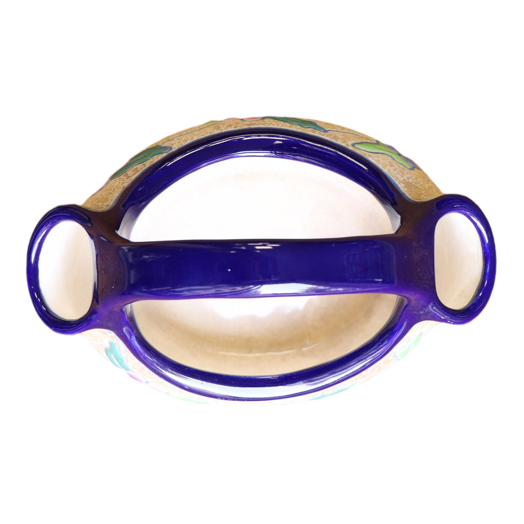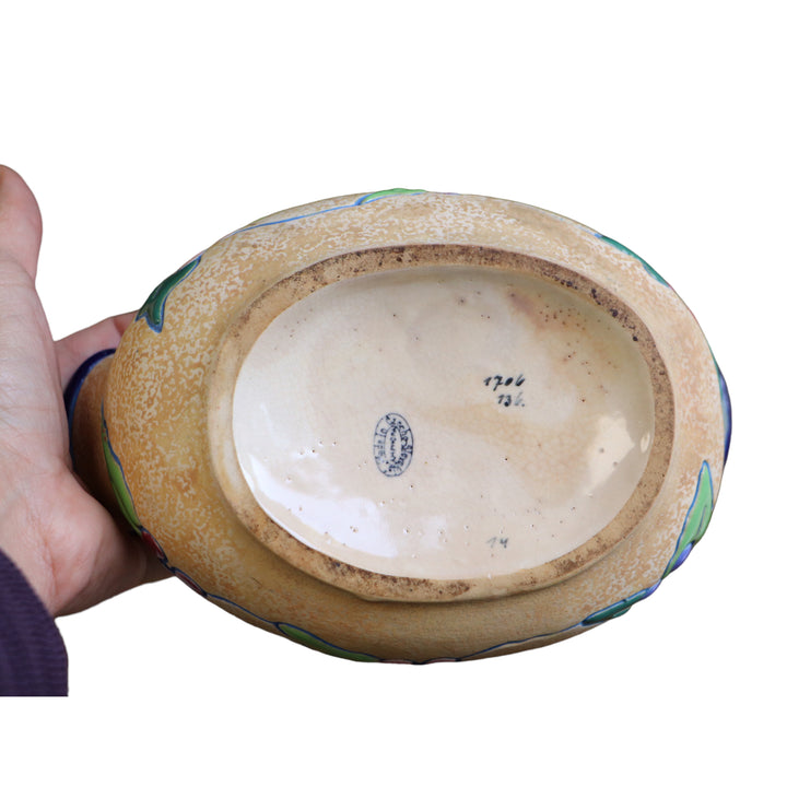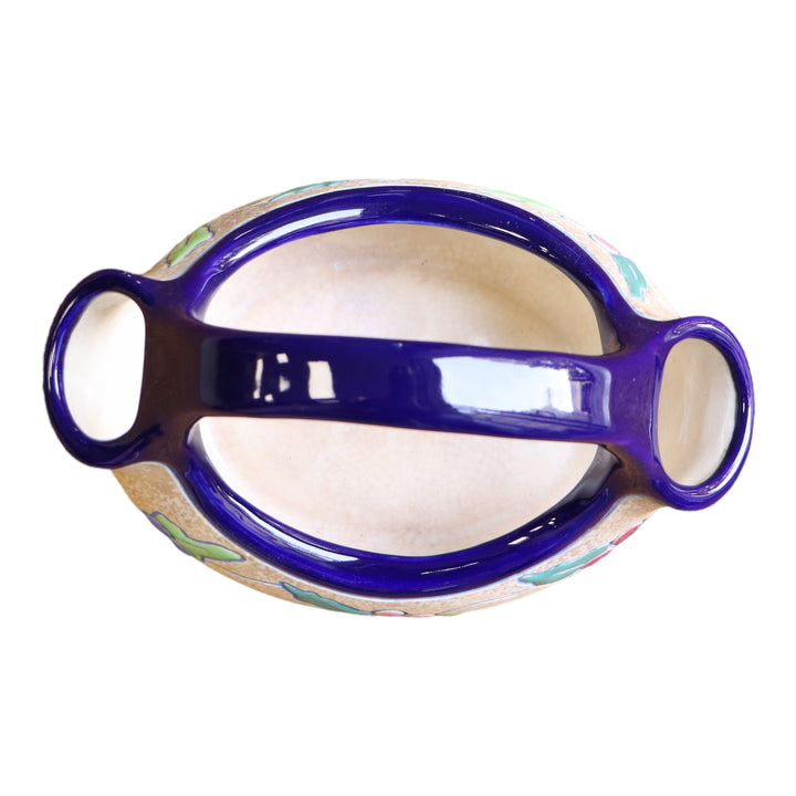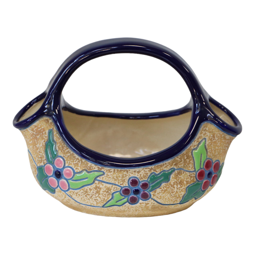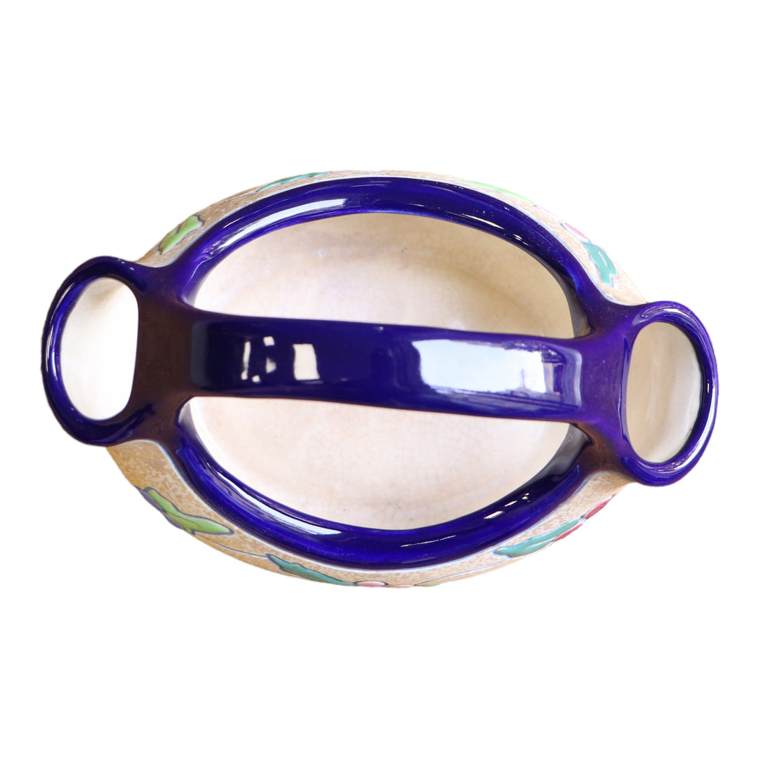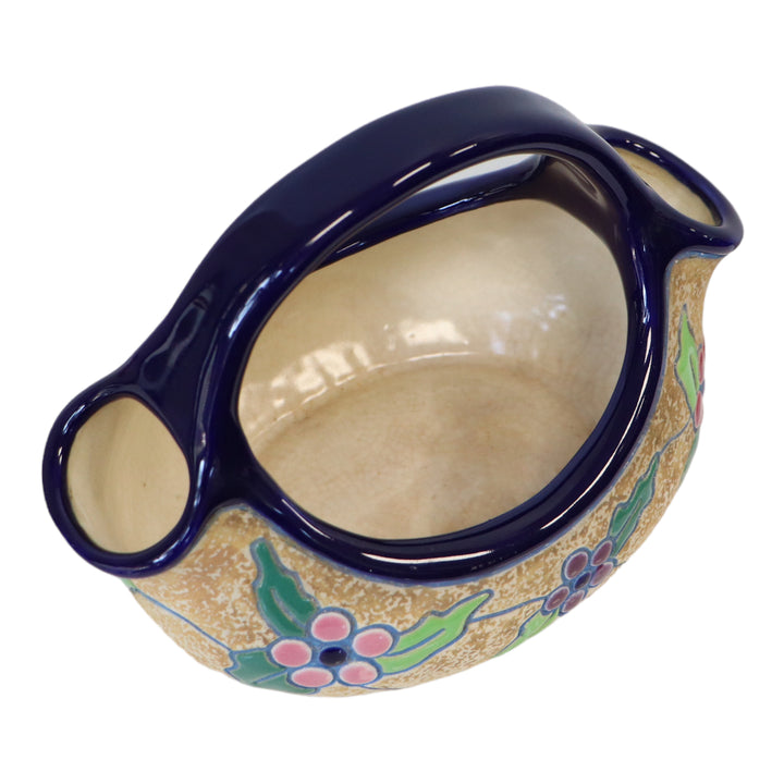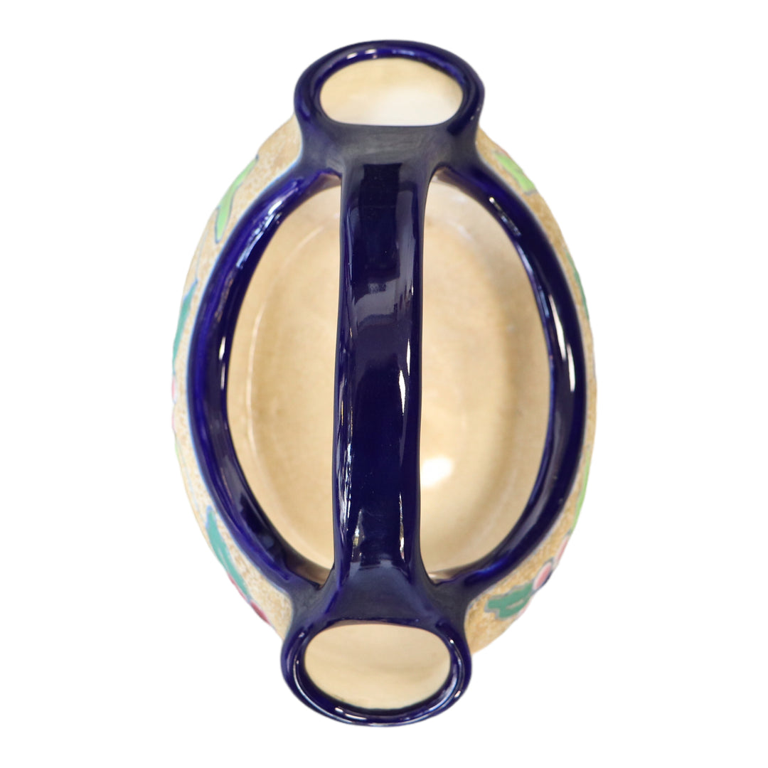 Vase AMPHORA à double bec Art Déco des années 30 en céramique émaillée bleu, rose et vert sur fond beige. Déco de feuilles et de baies de houx
