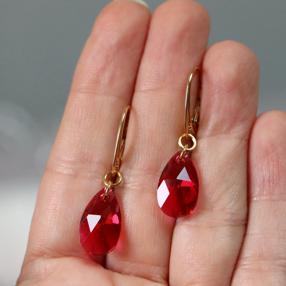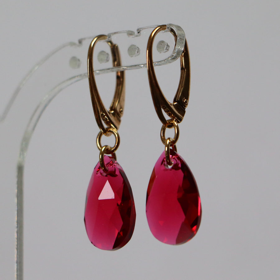 Boucles d'oreilles (crochets, dormeuse, puces ou à clips), cristaux Swarovski, argent doré, collection LARME, rouge framboise