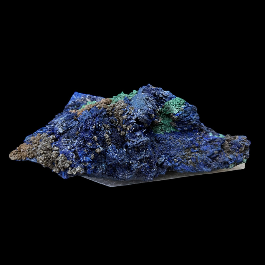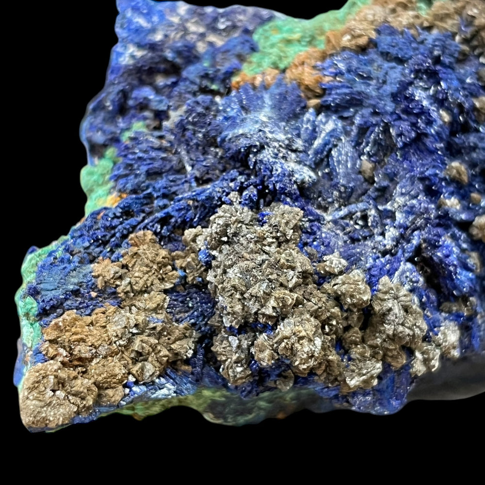 tres belle association de cristaux dazurite avec de la malachite et recouvert de cristaux bruns ( ankerite?) et blanc de calcite