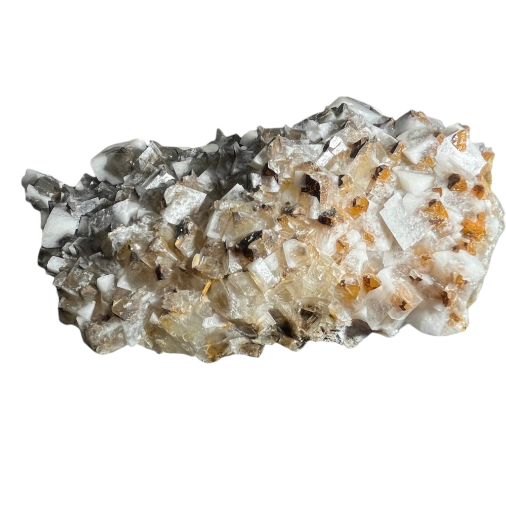 Hématite recouvrant les cristaux scalénoèdres sur lesquels ont poussé des cristaux rhomboèdres translucides et blancs