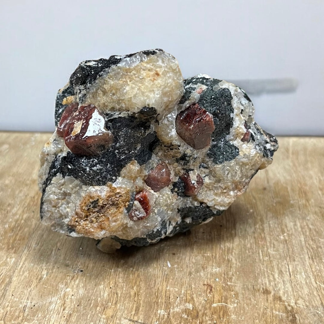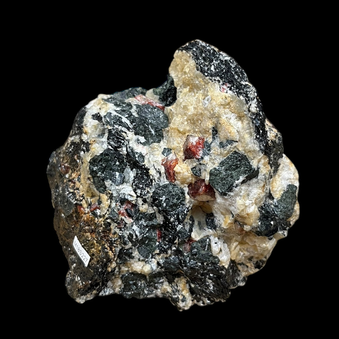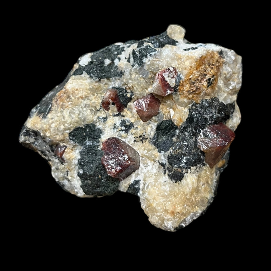 Cristaux de zircon rouge brique sur une matrice de marbre blanc et de biotite noire.