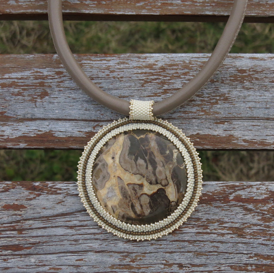 Matériaux : perles de rocailles de haute qualité japonaises; pendentif en septaria; cordon en cuir avec fermoir en acier inoxydable 316L (acier chirurgical) plaqué or (fait en Europe)