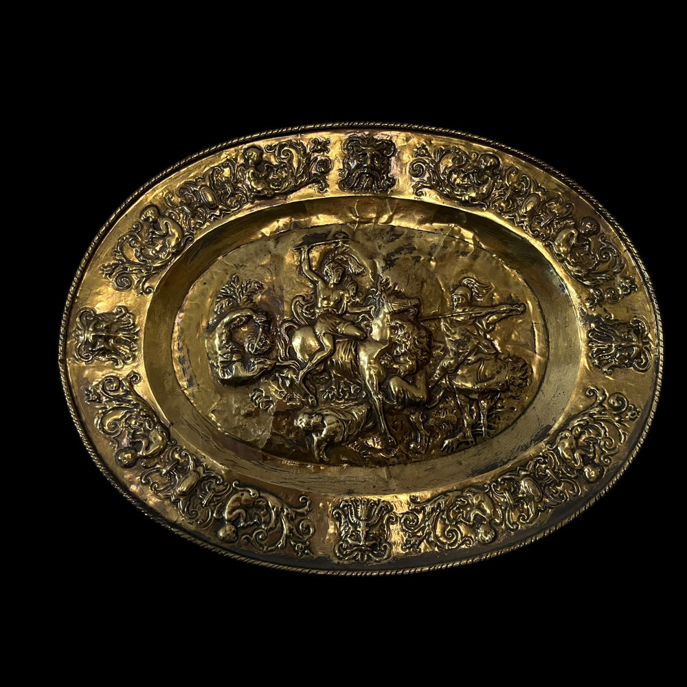 Dekorative Gericht in Kupfer Golden mit einer Jagdszene aus dem 19. Jahrhundert