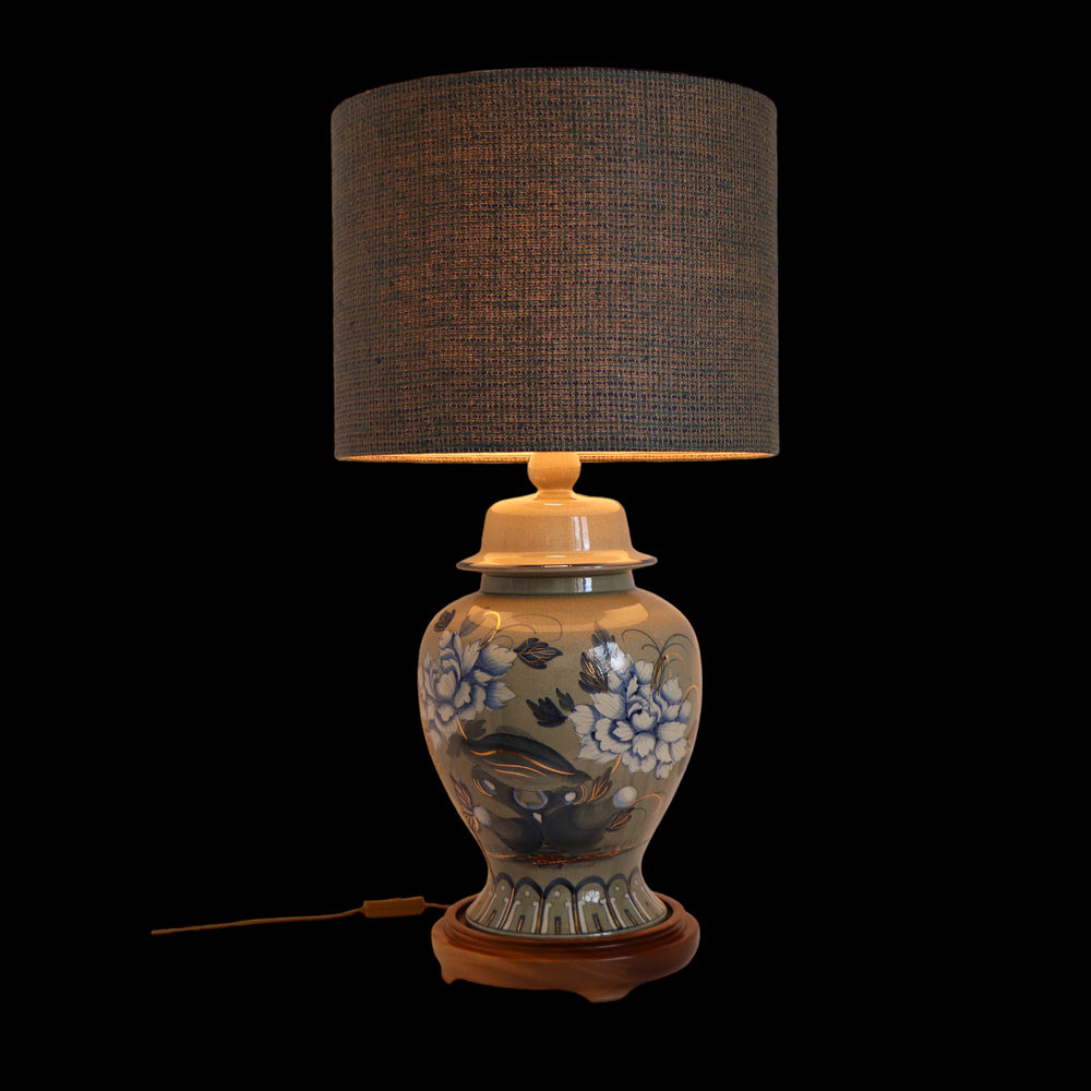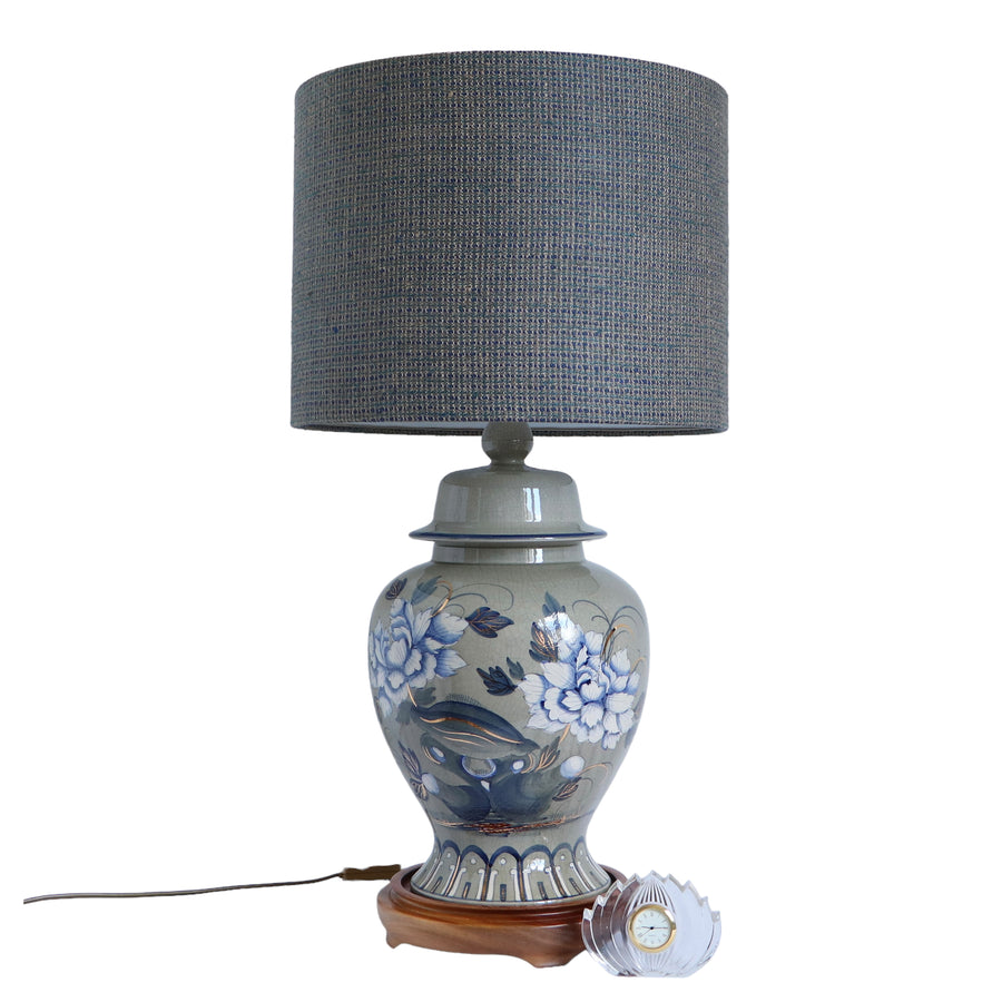 Keramiklampe mit einem in grau blauen Seide laminierten Lampenschirm (oder gebrochenes weißes).