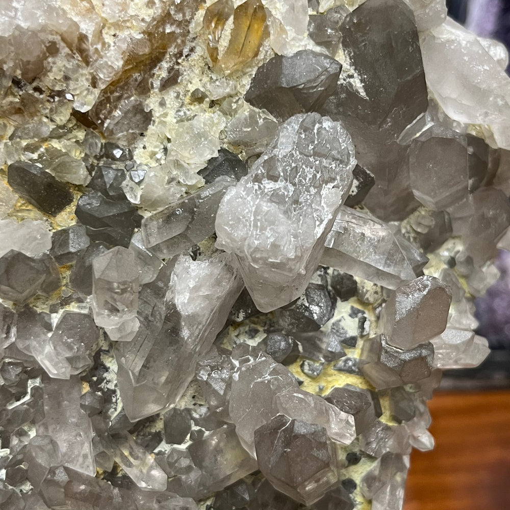 Schöne Trommel aus leicht geräuchertem Quarz mit bideterminiertem Quarz, befestigt, viele Endungen mit gelbem Depot und zwei kleinen Citrin -Bidéterate -Quarz
