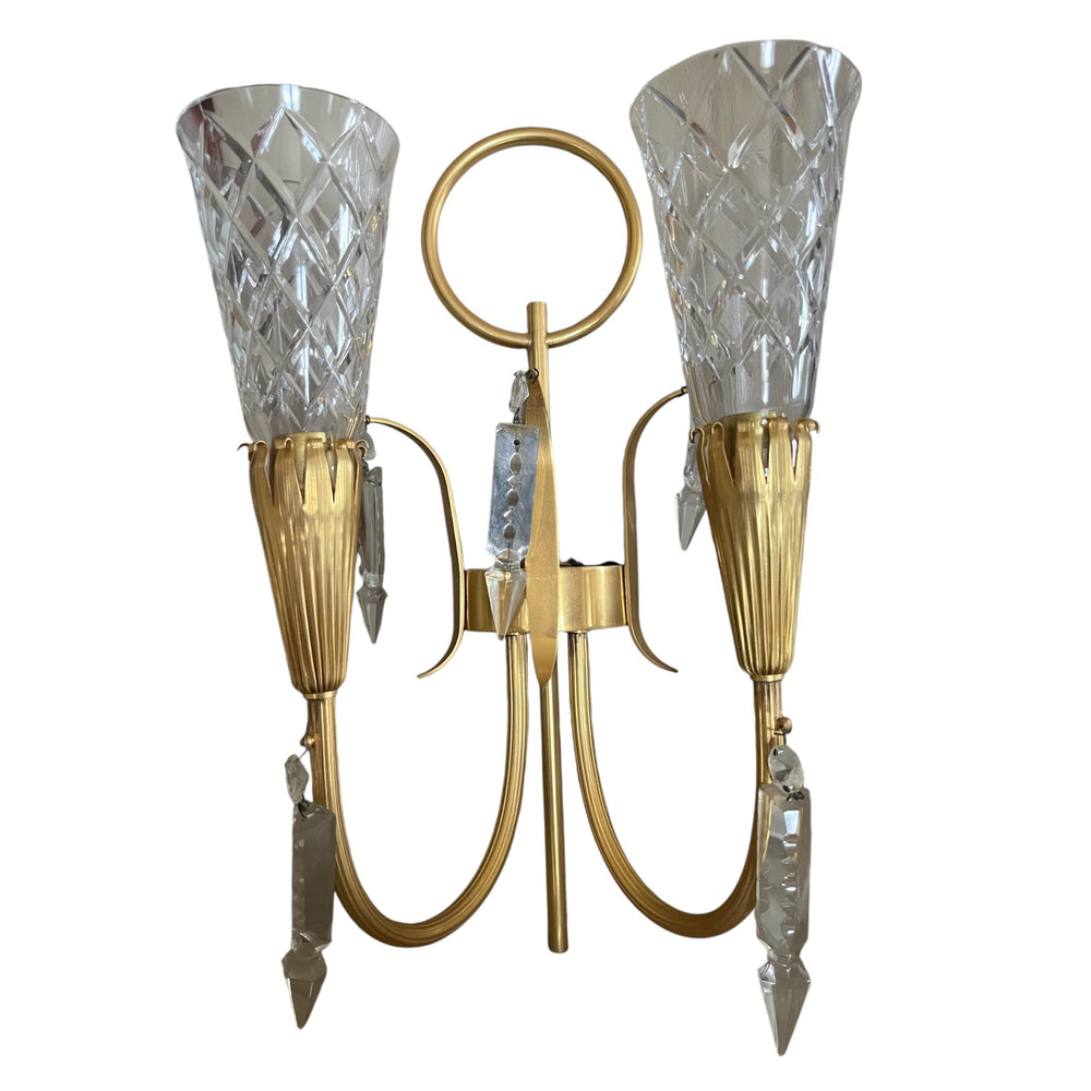 Very beautiful set of a lunel chandelier from the 1950s in golden iron at 10 lights and 2 sconces with 2 lights, supplied with two crystal replacement tulips handed by Albret Cristallerie
