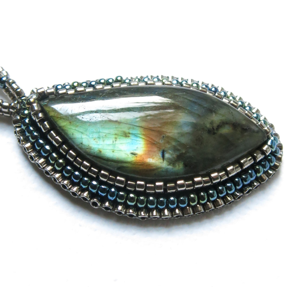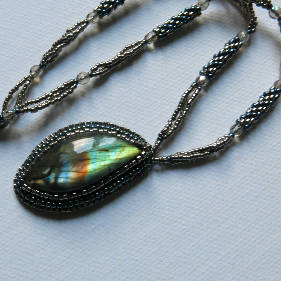Embroidered flower necklace - volcanic rhyolite & pearls miyuki
