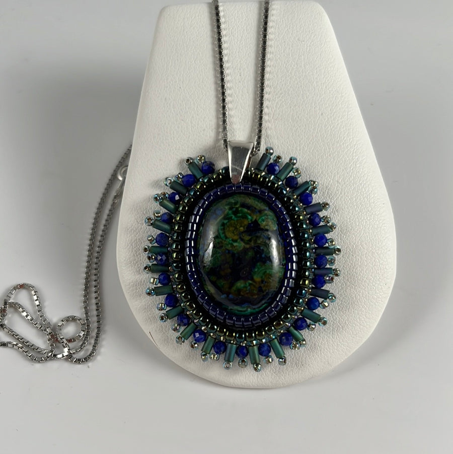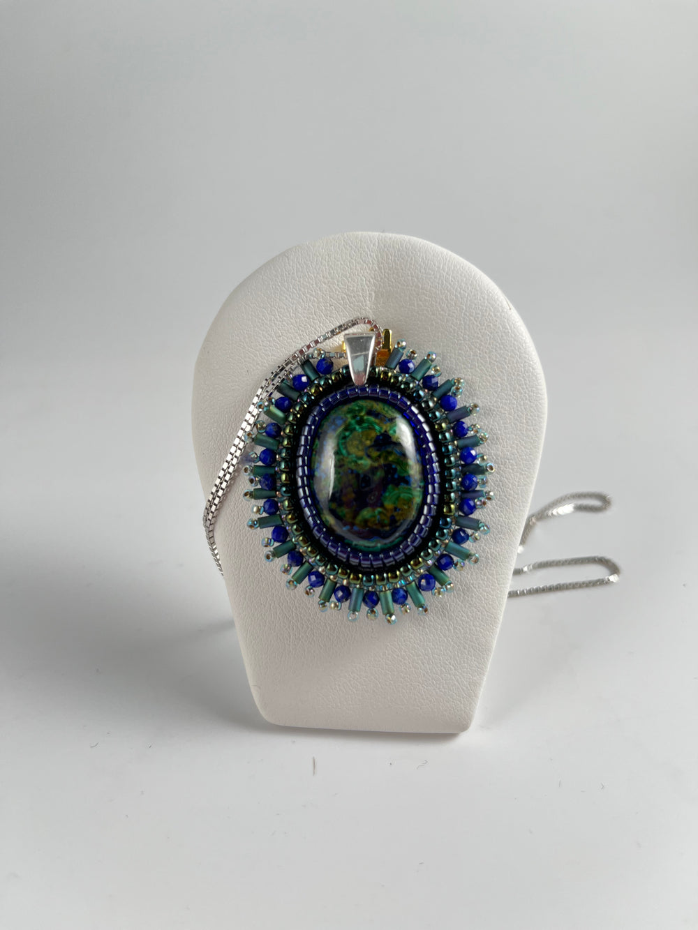Embroidered necklace with Azurite Malachite and lapis lazuli