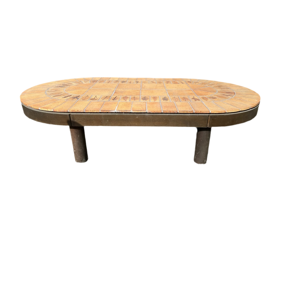 Large oval coffee table "ferns" model with tray lined with ceramic tiles and natural wood structure
