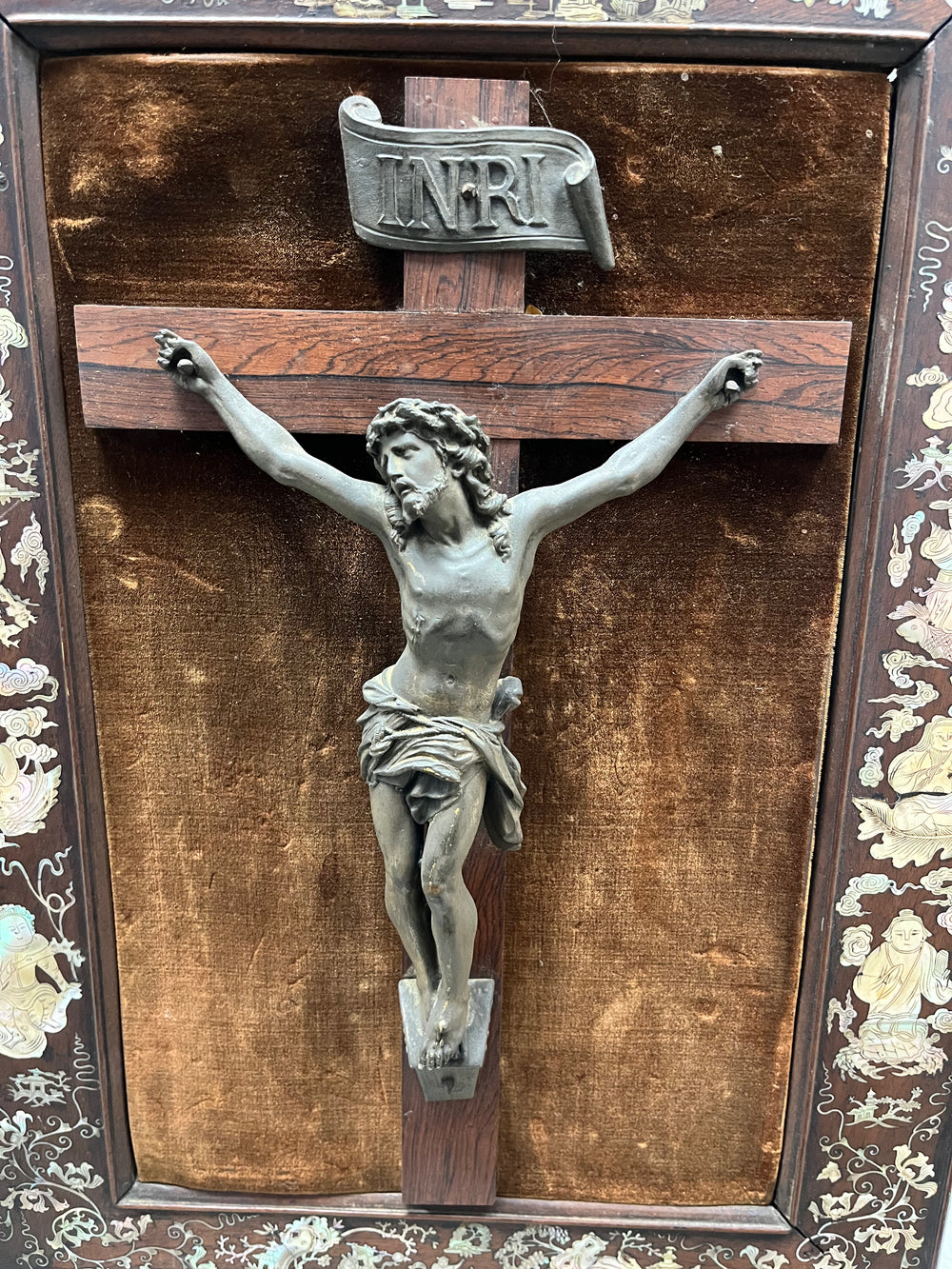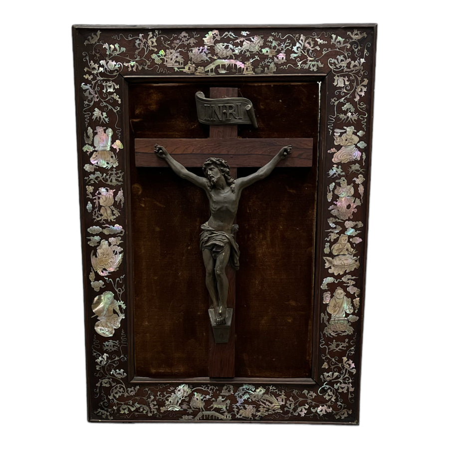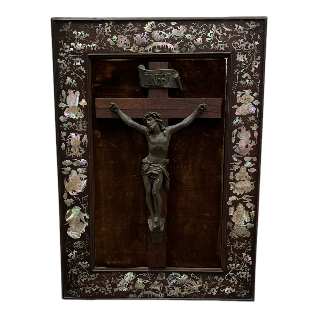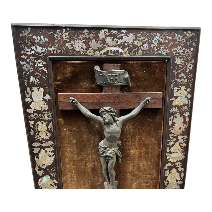23 cm bronze Christ on his cross in a magnificent Indochinese frame in ironwood and mother-of-pearl inlay decorated with horsemen in landscapes 37x51 cm