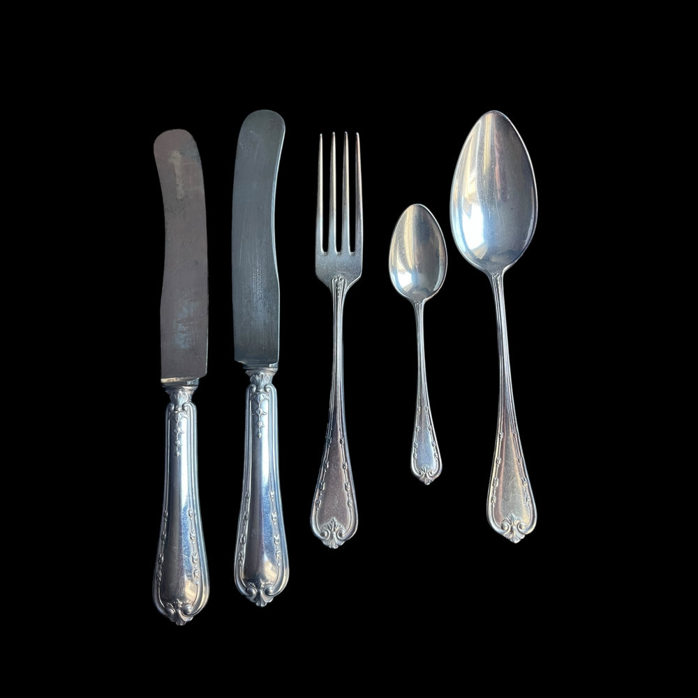 6 forks and 6 small spoons (slight wear) 6 large silver metal spoons 100g and 6 large silver knives firing 100g Louis XV style