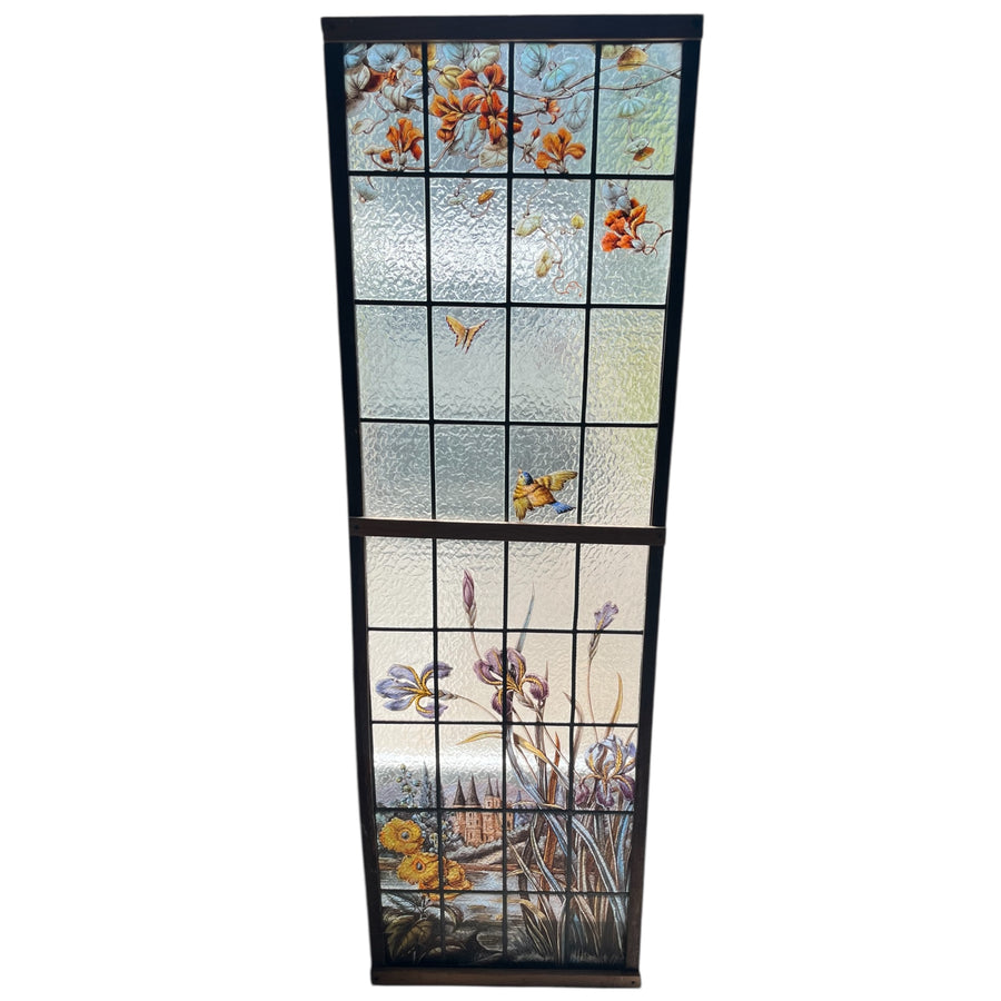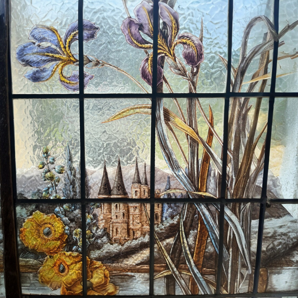 Vitrail painted in greyness and enamels on cathedral glass representing a river edge scene with a castle in the background (rare scene), iris and clematis with a bird and a butterfly