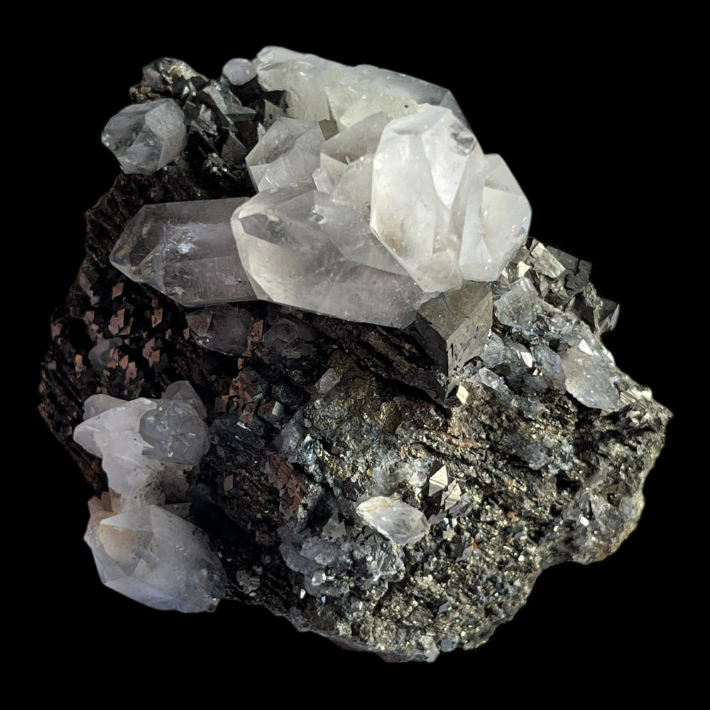 Very nice piece from the 1970s with bidéterminated quartz of good size at the top on a pyrrhotite crystal half pseudomorphose in pyrite with arsenopyrite and calcite crystals