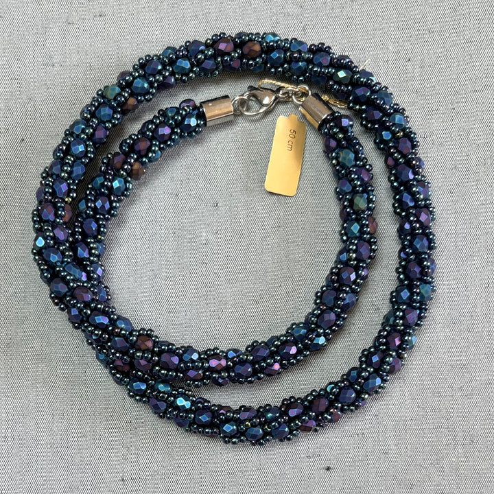 Spiral crochet necklace with Miyuki beads, metallic blue, 50 cm
