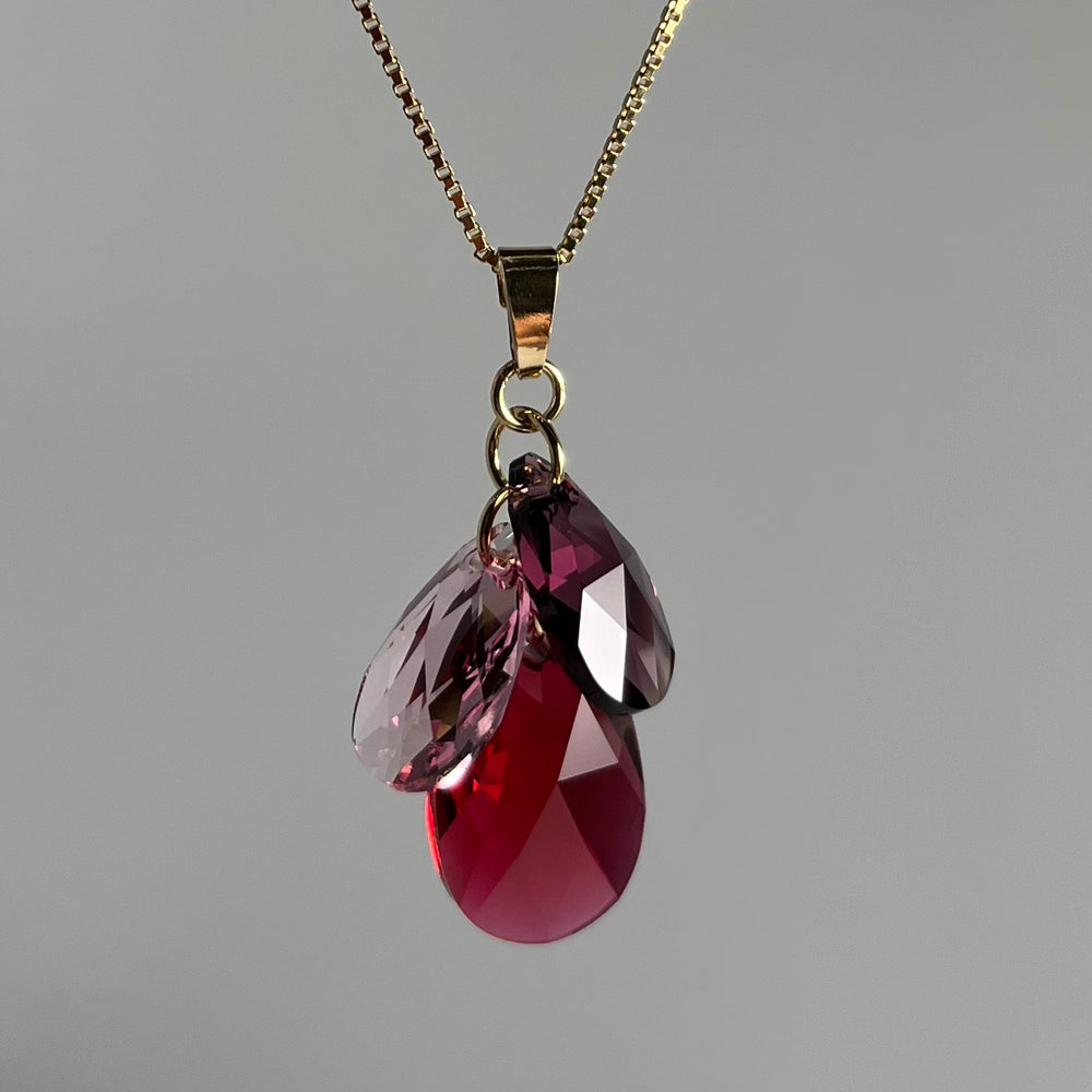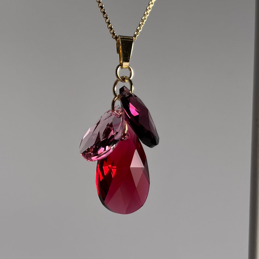 スワロフスキークリスタル、ゴールデンシルバー、ラズベリーレッド、花のネックレス