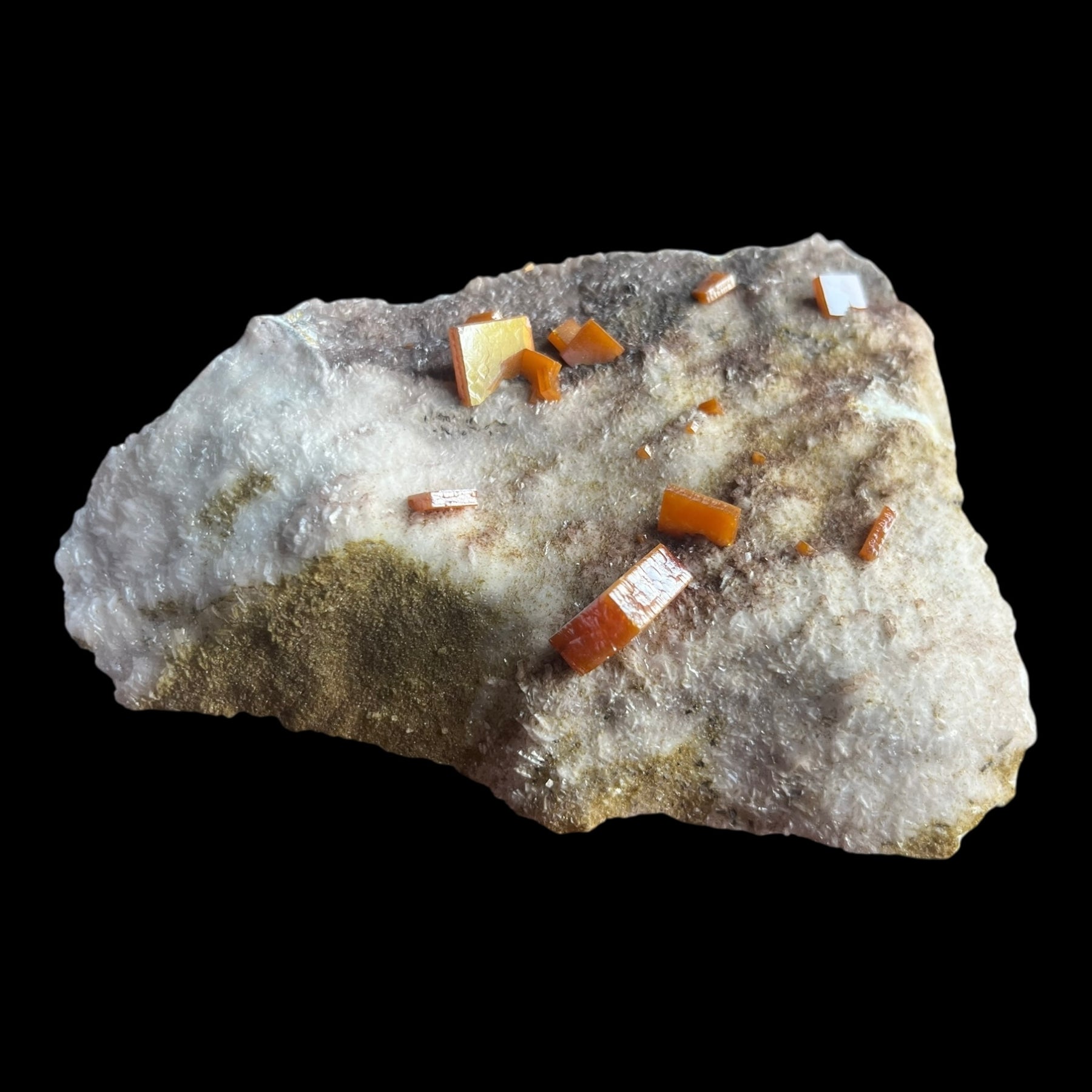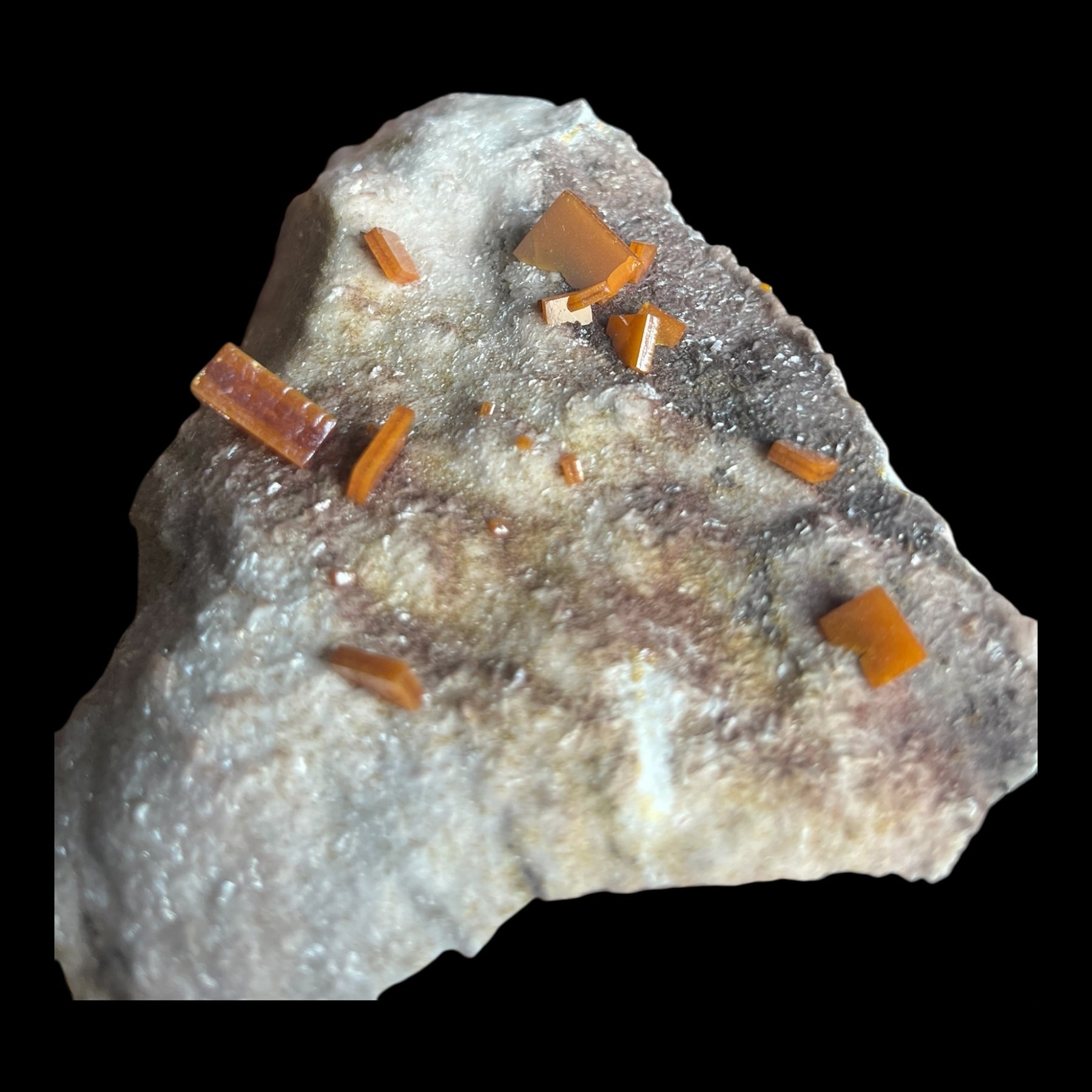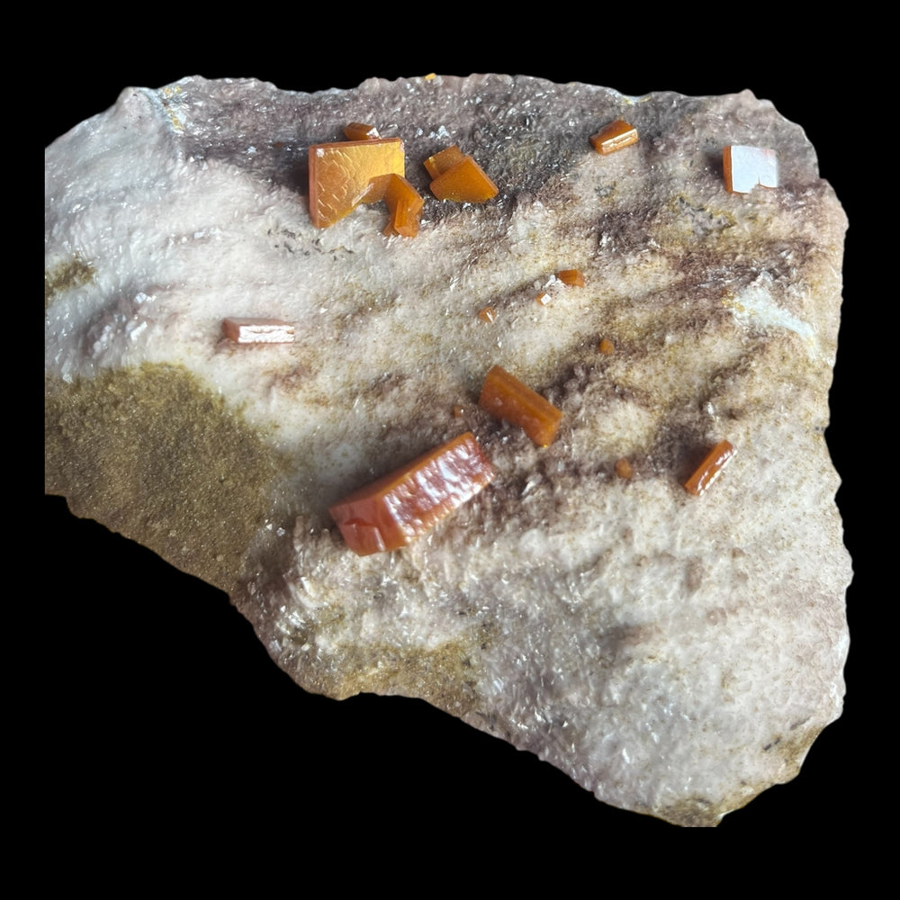 Изолированные кристаллы вульфенита (большие 1,4x1,3x0,6 см) типа «бутерброд», с зеркалом блеска на матрице, покрытой сверкающим ванадинитом (сорт эндличита), коричневым десклозитом и белым кальцитом. Лица кристаллов WУльфенит - карамельный цвет и центр коричневого меда