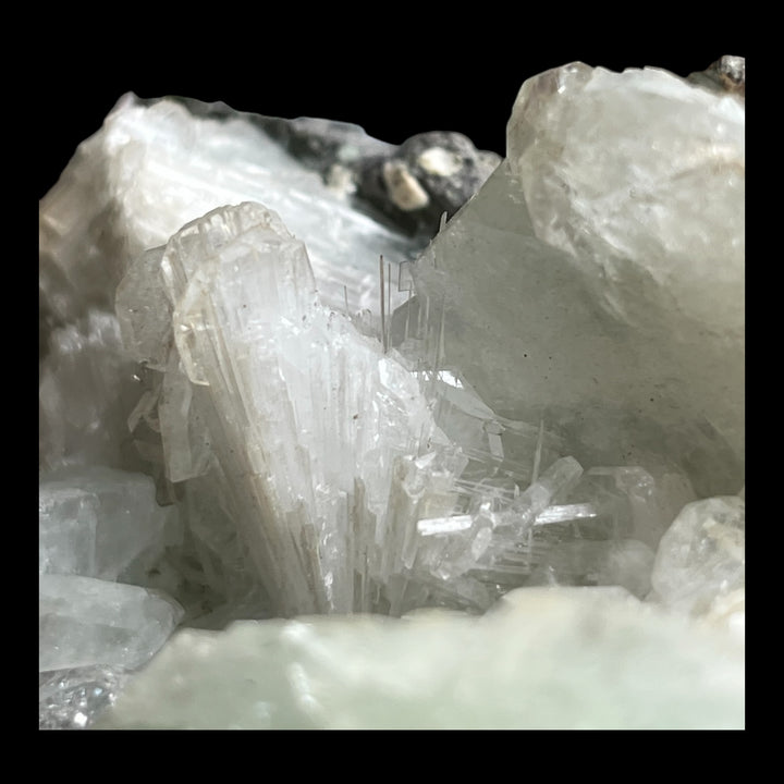 Большой фторапофилит кристалл 4,8x2x2 см, расположенный сверху с другими кристаллами, связанными со сколецитом