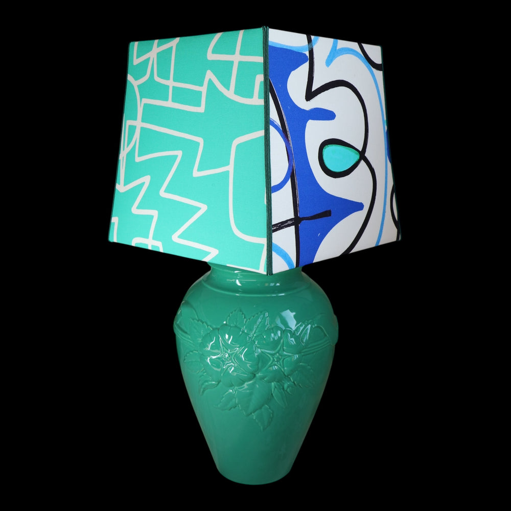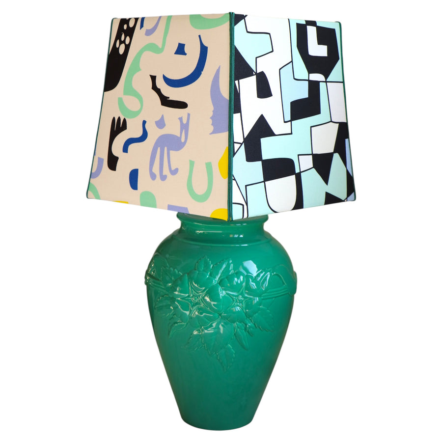 Древнее пятно в глазированной керамике, глубоководной зеленой, украшенной овощным декором с облегчением. Абажур, в форме ручной работы в издательской ткани с современной графикой, создает дерзкий контраст между традициями и современностью.