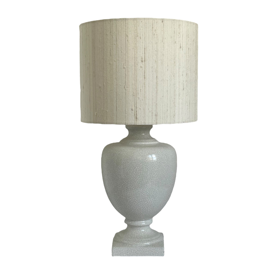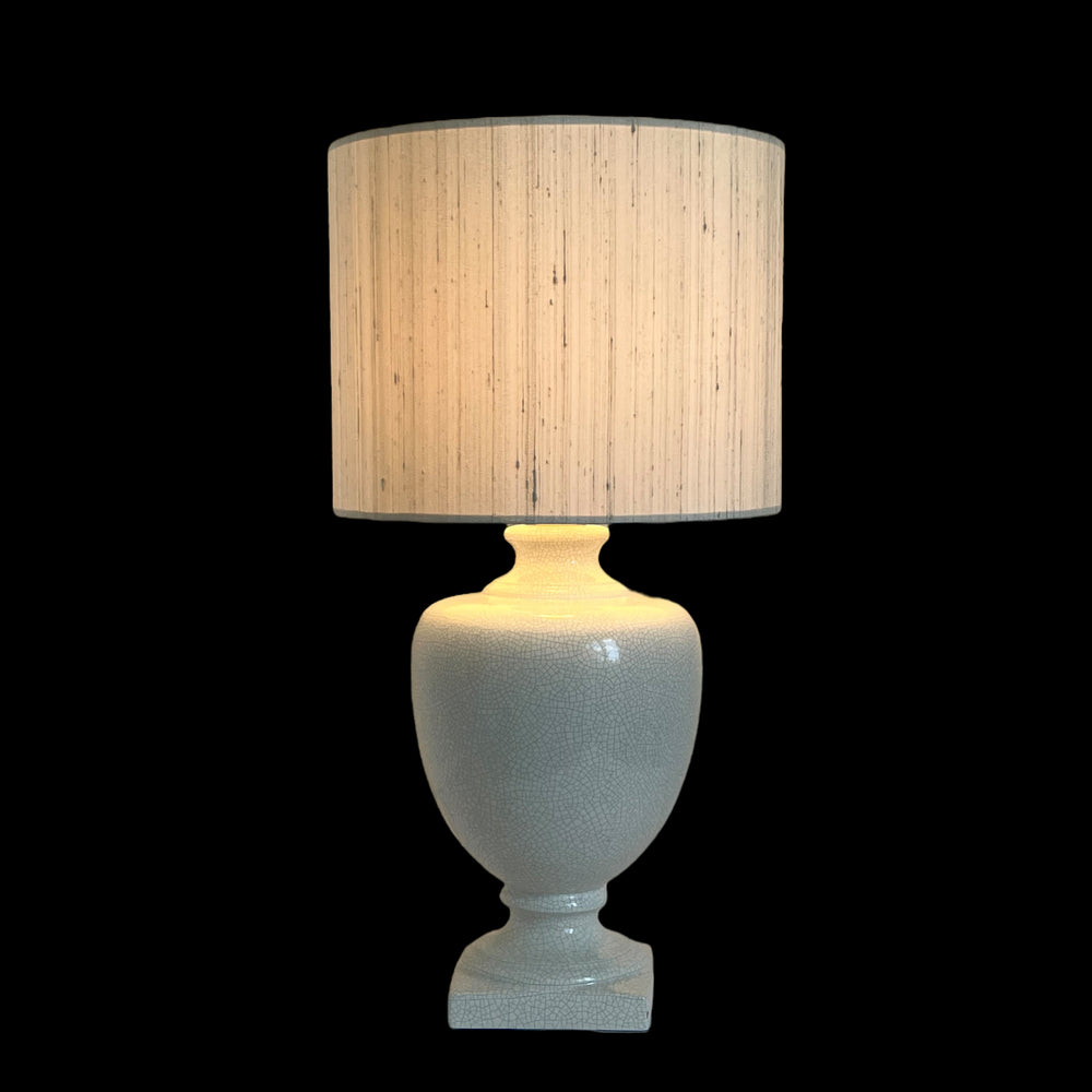 Винтажная потрескавшаяся керамическая лампа с тканевым абажуром, бело-голубого цвета.