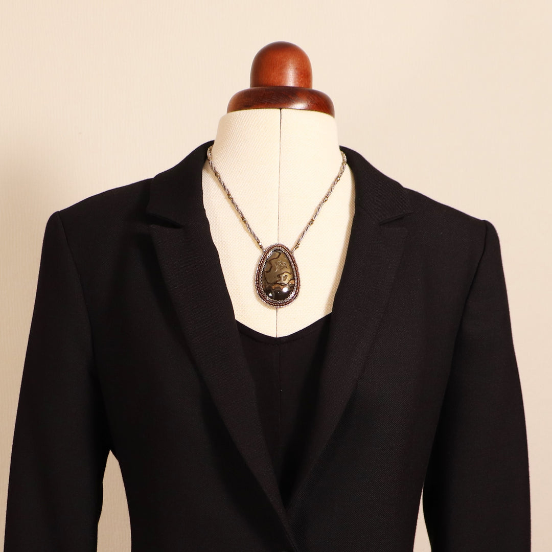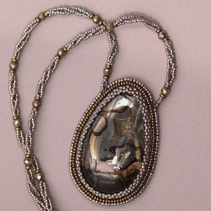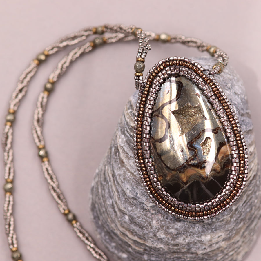 Колье с пиритизированным аммонитом и желтым кальцитом