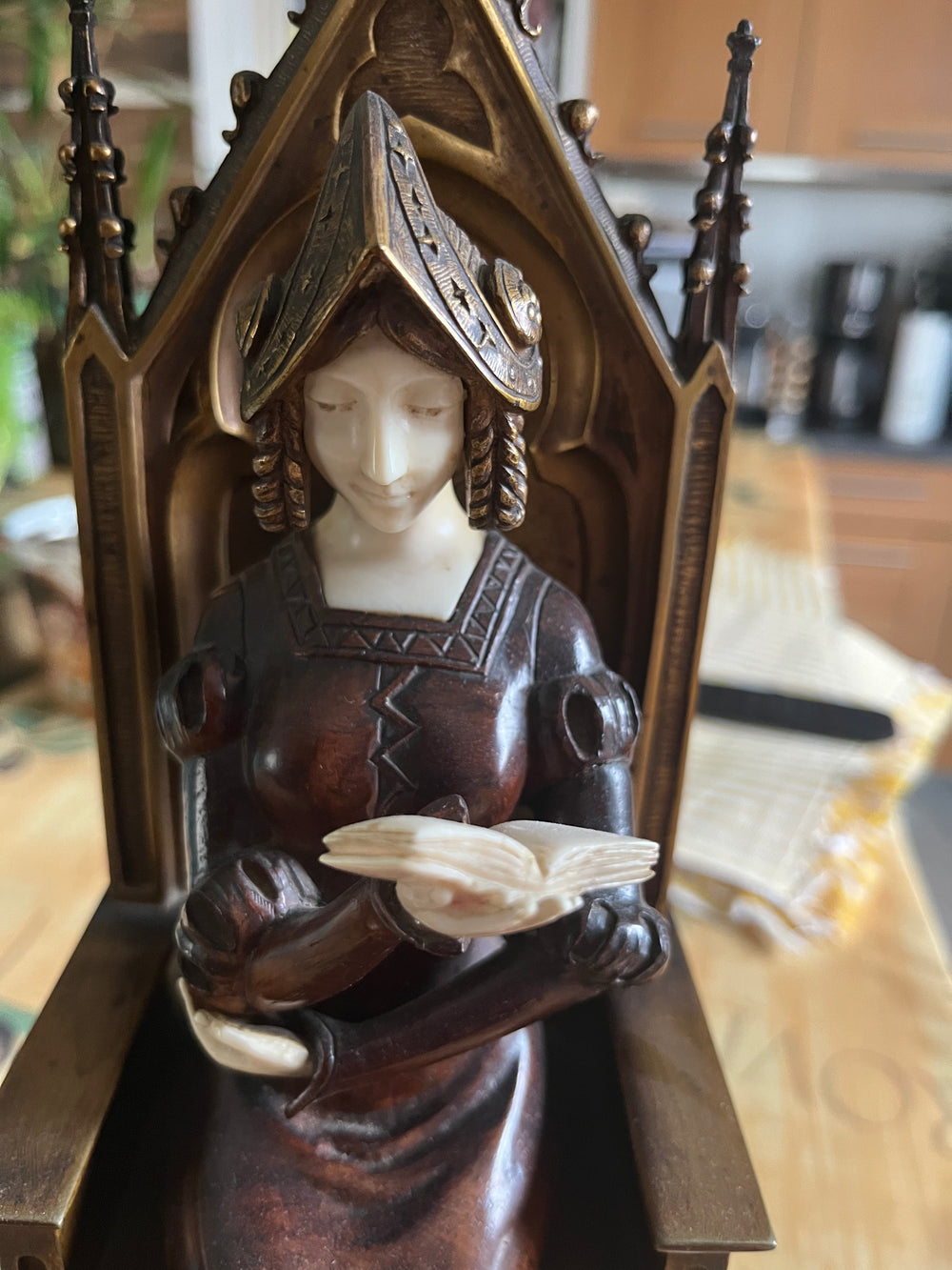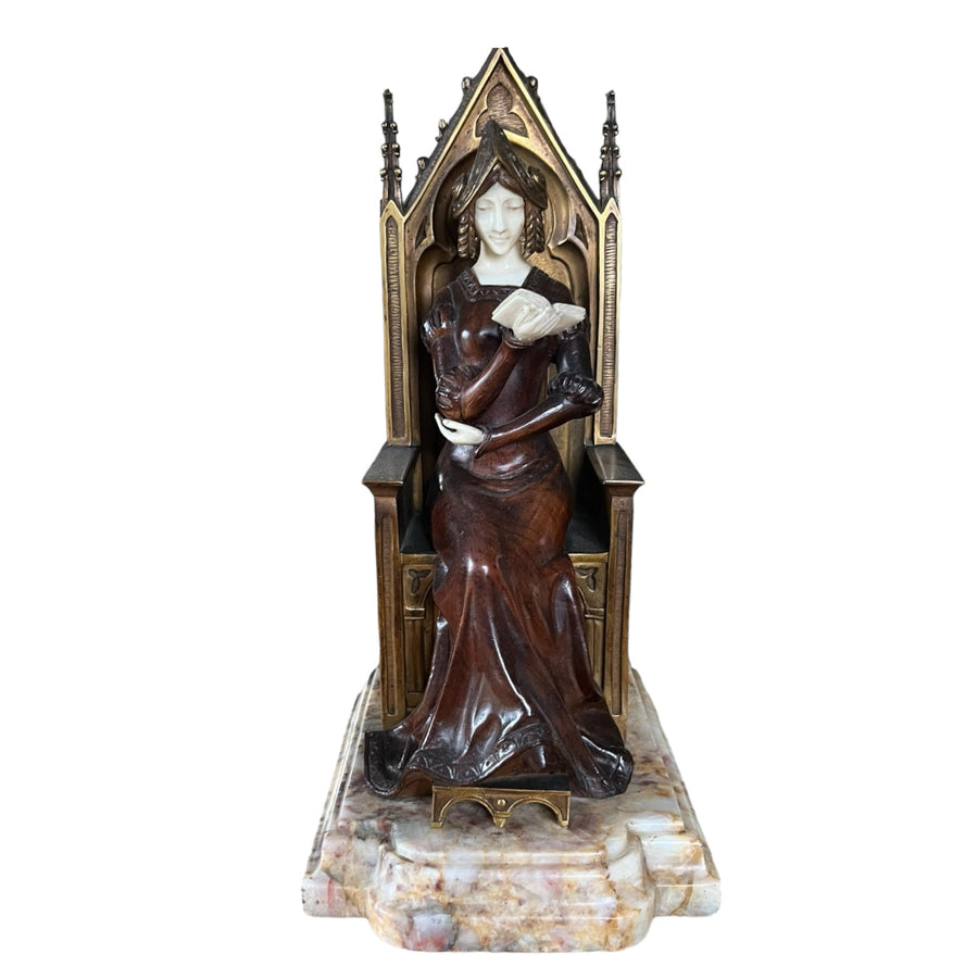 Скульптура Chrysélephantin в бронзе, скульптурное черное дерево и слоновая кость, представляющие средневековую принцессу, читающую на троне в очень хорошем состоянии